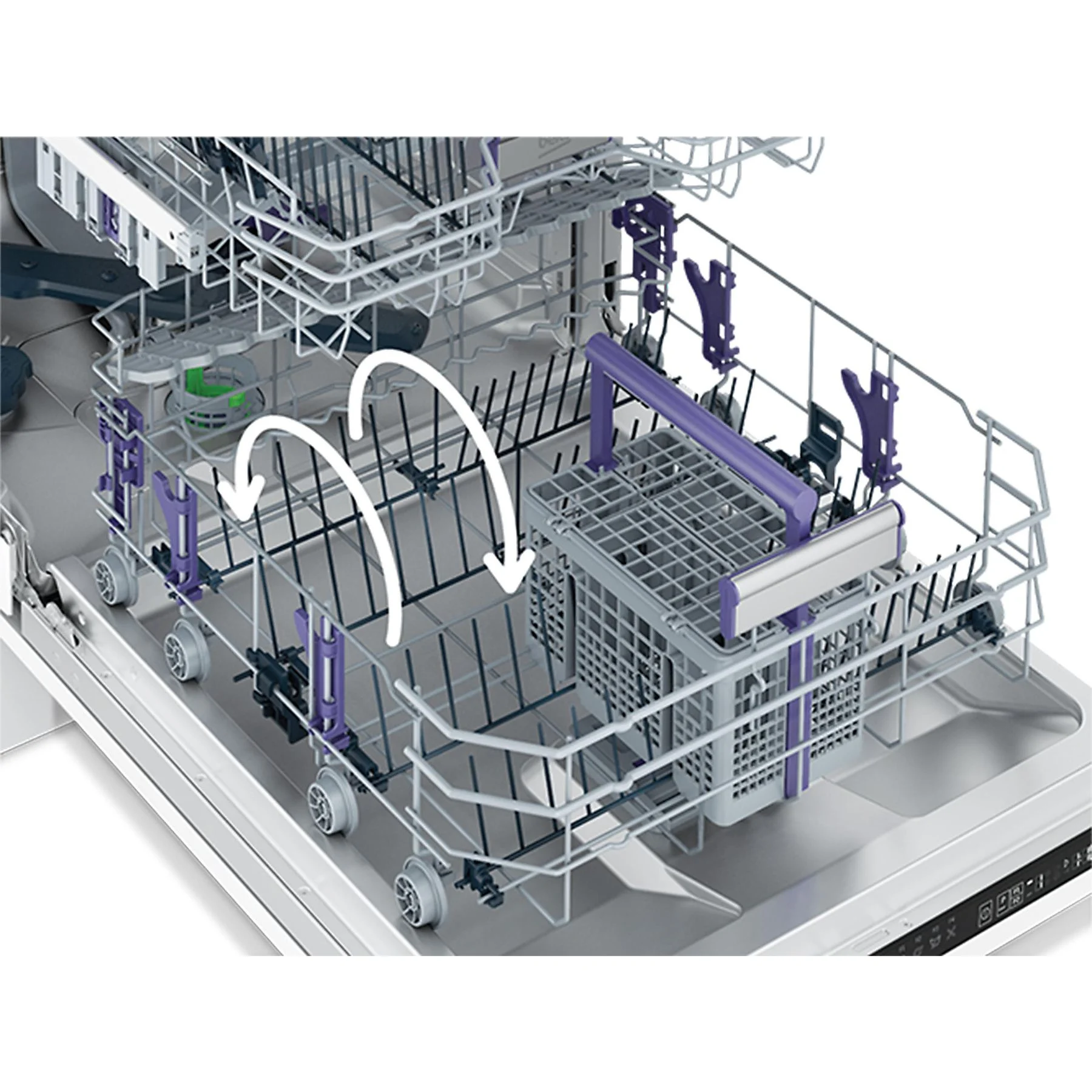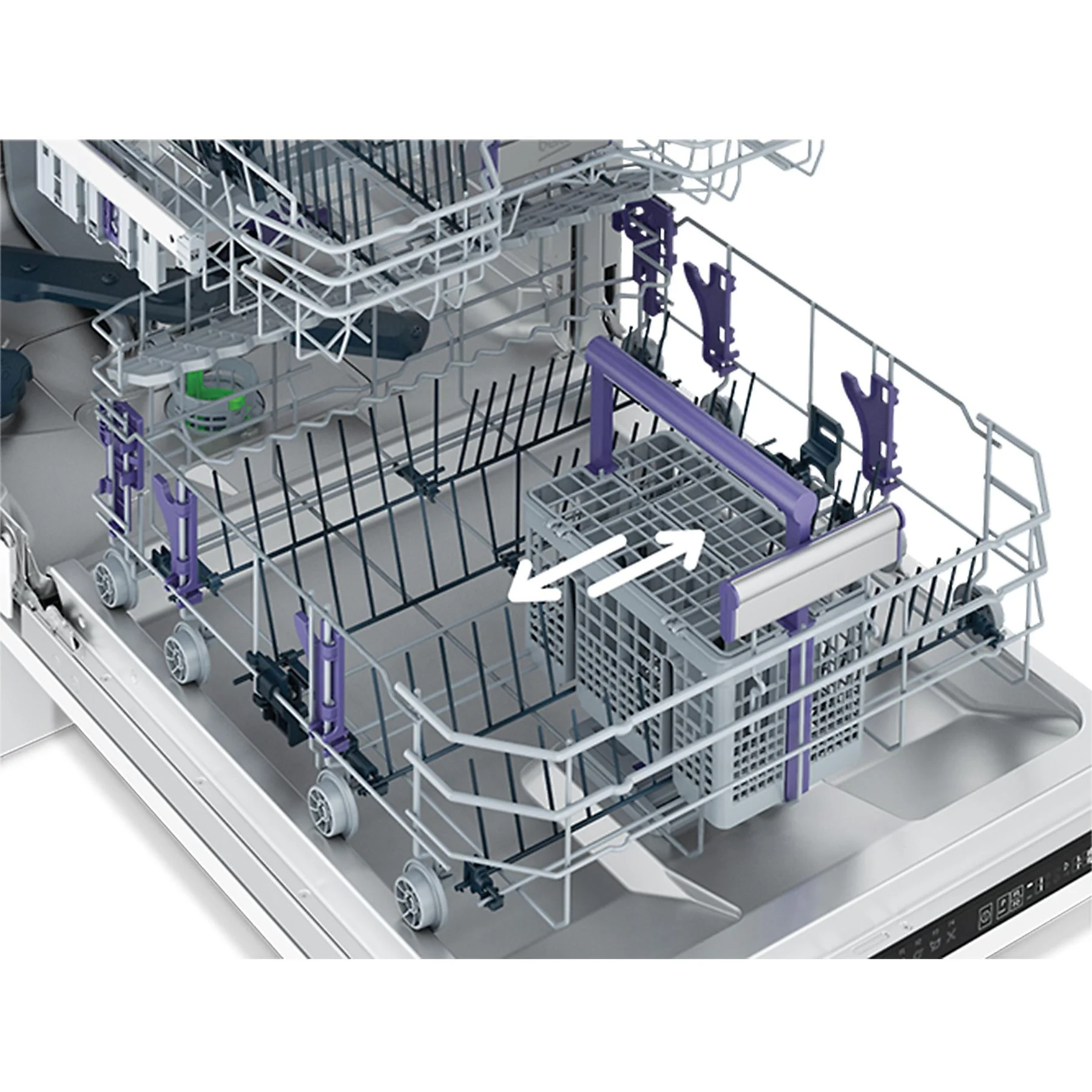 Der Besteckkorb ist eine clevere Erfindung, aber er ist oft im Weg, wenn Sie einen großen Topf im unteren Korb unterbringen wollen. Mit dem verschiebbaren Besteckkorb wird dieses Problem gelöst, da er frei nach rechts und links beweglich ist, sodass Platz für diese größere Gegenstände geschaffen wird.