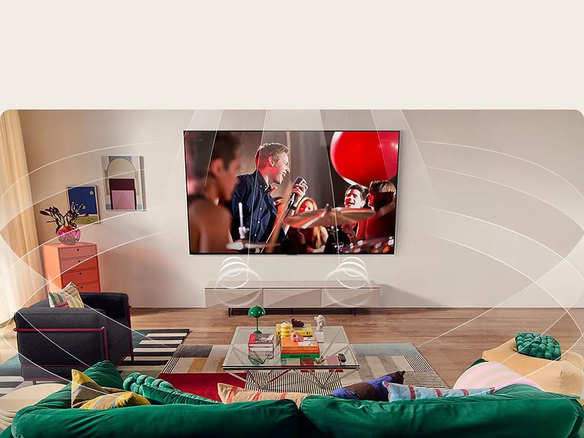 Das leistungsstarke 2.0-Soundsystem der LG QNED AI TVs mit dem intelligenten AI Sound Pro und Virtual 9.1.2 Up-Mix sorgt für beeindruckenden Klang, der nach unten abstrahlt und so ein außergewöhnliches Sound-Erlebnis schafft. AI Clear Sound verbessert die Sprachverständlichkeit durch präzise Tonkorrektur, während der Dynamic Sound Booster mithilfe von AI-Verarbeitung Klangtiefe und Dynamik verstärkt. Für immersiven Surround-Sound kannst du deine LG Soundbar mit dem LG QNED AI TV über WOW Orchestra verbinden – sofern deine Soundbar diese Funktion unterstützt – und ein perfekt abgestimmtes Klangbild genießen, das dich mitten ins Geschehen zieht.